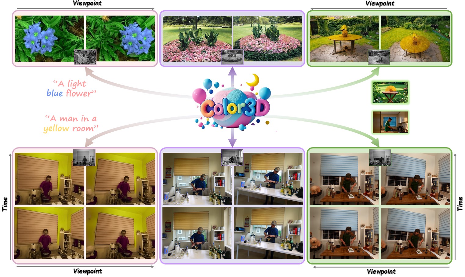 Color3D is a unified controllable 3D colorization framework for both static and dynamic scenes, producing vivid and chromatically rich renderings with strong cross-view and cross-time consistency. Our method supports diverse colorization controls, including language-guided (left), automatic inference (middle), and reference-based (right), showcasing its versatility and practical value.