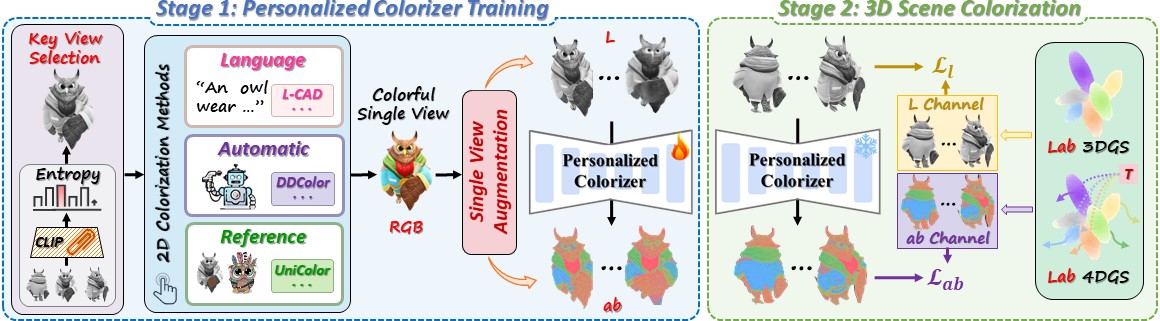 The overall pipeline of Color3D. Our framework comprises two primary stages. In the first stage, we initially identify the most informative key view from the given monochromatic images and video frames, and employ an off-the-shelf image colorization model to generate a colorized single view. Then, a single view augmentation scheme is elaborated to amplify the data, and the augmented samples are subsequently used to fine-tune a per-scene personalized colorizer. In the second stage, this personalized colorizer is utilized to infer consistent chromatic content of the remaining views or frames, and directly reconstruct the colorful 3D scene with Lab color space 3DGS or 4DGS.